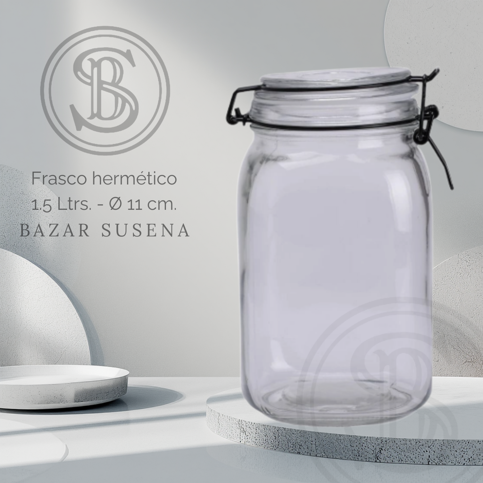 Frasco hermético vidrio con broche negro.