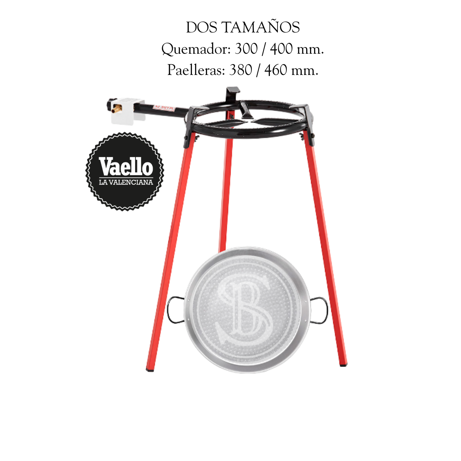 Paellera (acero pulido) con quemador en dos tamaños.